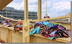 The hand crocheted and/or knitted panels were laid out along the walkway, ready to be secured with zip ties. Each metal panel of the bridge got a fiber panel on the inside and on the outside.